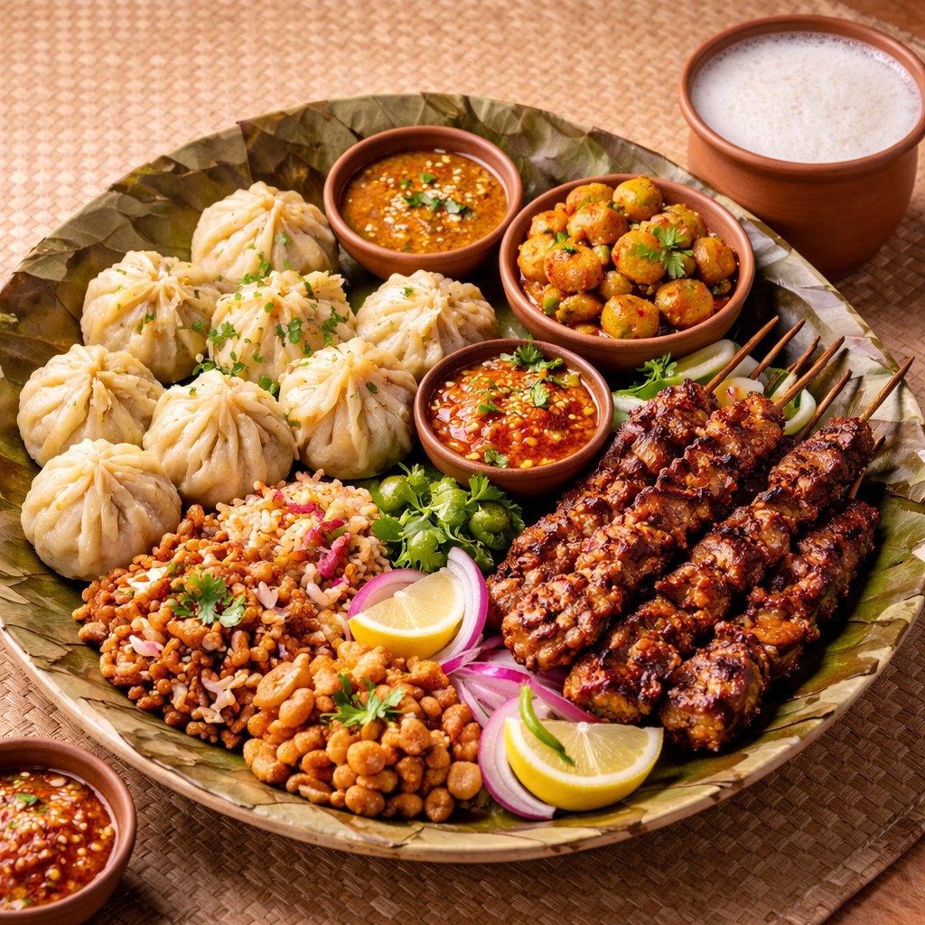 ✅ Try a Newari Khaja Set: Newari cuisine — native to the Kathmandu Valley — is vibrant and deeply traditional. A khaja set includes multiple items like chhoyela (spiced grilled meat), beaten rice (chiura), bara, and pickles.